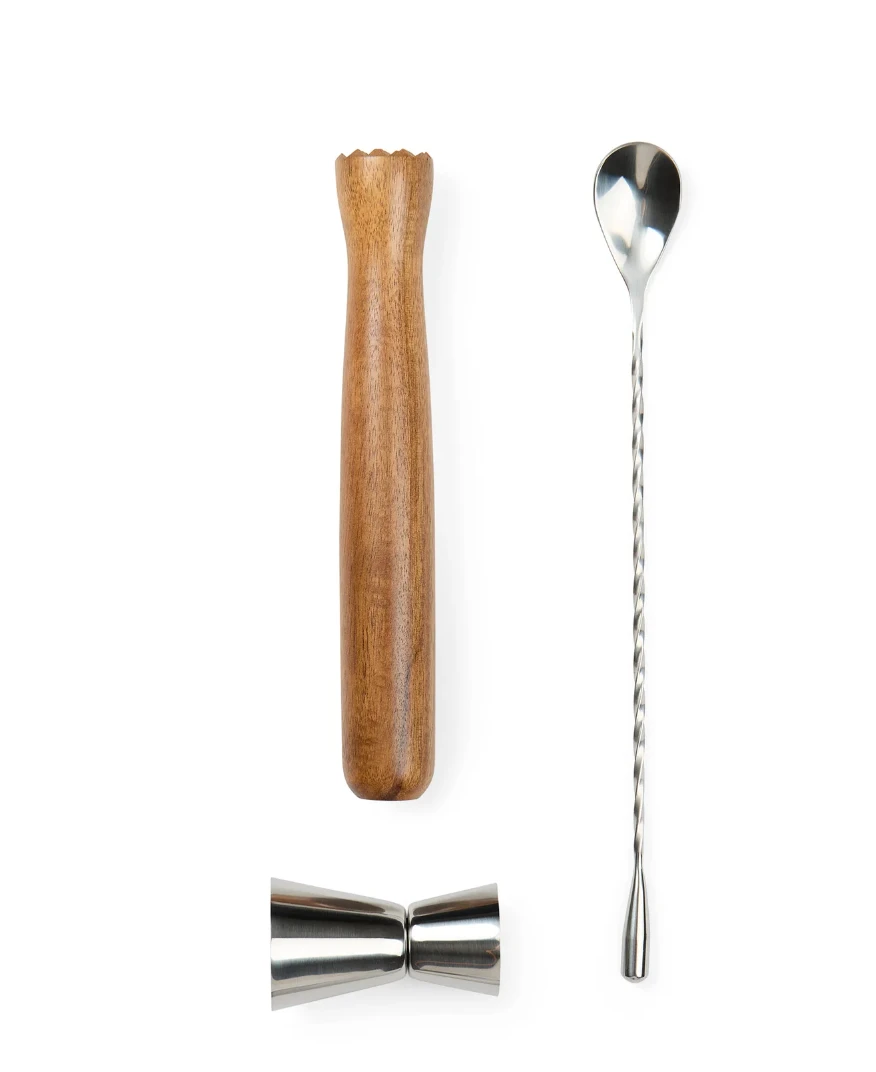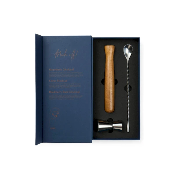 "Story of mocktails" on tyylikkäästi pakattu baarisetti lahjalaatikossa, joka muistuttaa klassista kirjaa. Tämä setti sisältää muddlerin FSC®-sertifioidusta akaasiapuusta, jiggerin ruostumattomasta teräksestä ja kierretyn baarilusikan, kaikki suunniteltu auttamaan sinua luomaan täydellisen juoman. Ainutlaatuinen pakkaus ei vain suojaa työkaluja, vaan auttaa sinua myös luomaan omia hauskoja ja herkullisia mocktaileja, mikä tekee siitä ihanteellisen lahjan kaikille miksologian harrastajille. Lahjalaatikko on valmistettu FSC®-sertifioidusta paperista.
