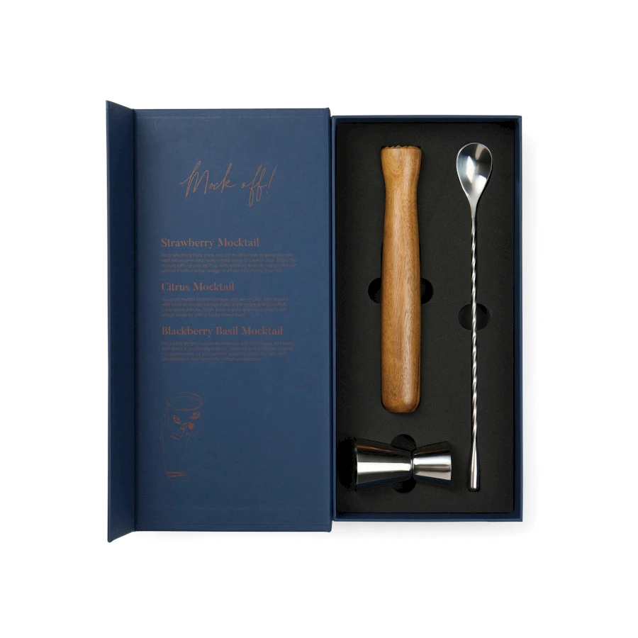 Sukella värikkääseen mocktail-juomien maailmaan Story of Mocktail -setin avulla, joka on pakattu tyylikkääseen kirjaa muistuttavaan lahjarasiaan. Setti sisältää FSC®-sertifioidusta puusta valmistetun murskaimen, ruostumattomasta teräksestä tehty jigger-mittalasin ja pyörteisen baarilusikan. Uniikki pakkaus suojaa välineitäsi ja inspiroi sinua luomaan omia hauskoja ja herkullisia juomia ja mocktaileja, tehden siitä täydellisen lahjan kaikille juomaharrastajille. Lahjalaatikko on valmistettu FSC®-sertifioidusta paperista.