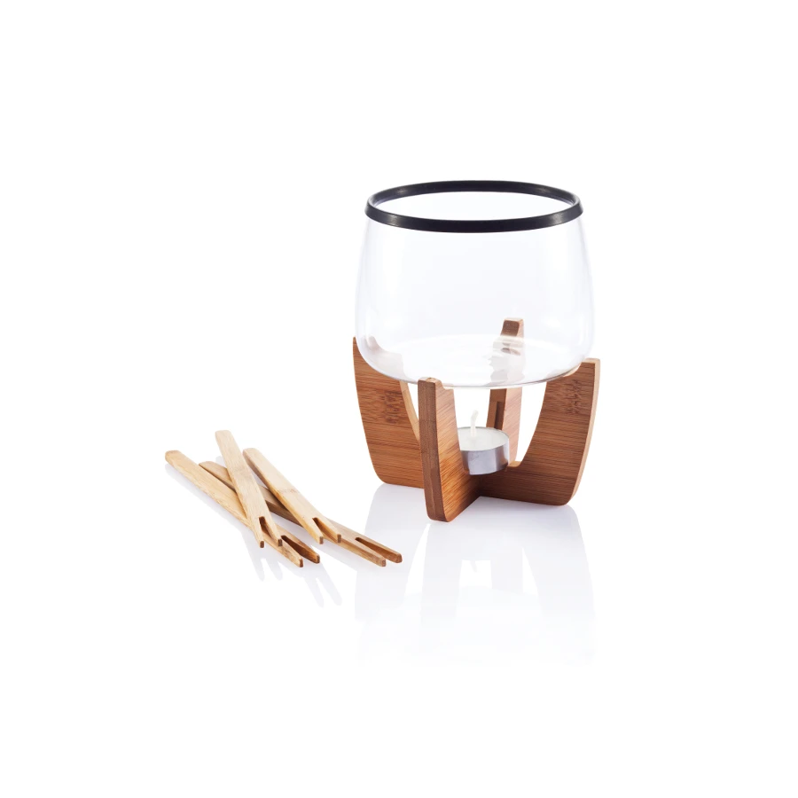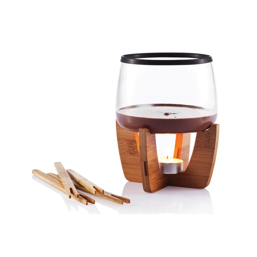 Cocoa-suklaafonduesetti on lahjasetti jälkiruokien nauttimiseen. Mukana neljä fondue tikkua, joita voi käyttää yhdessä ystävien kanssa tai muuten vain romanttisella illallisella. Settiin sisältyy myös tuikkukynttilä. Koko: 8,5 x 12,4cm