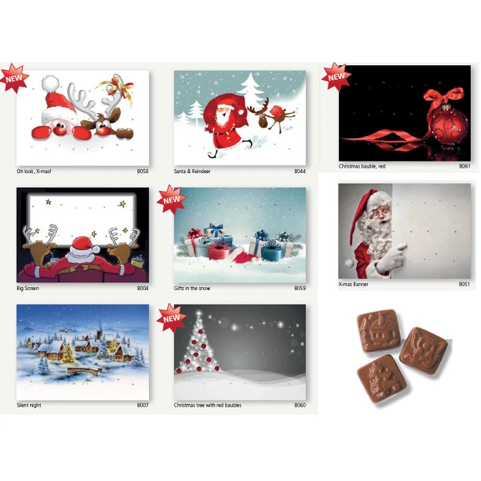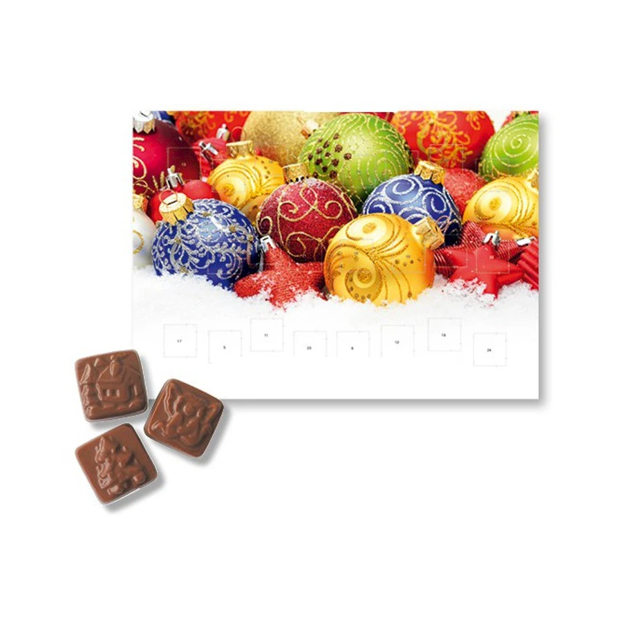 Suklaajoulukalenteri painatuksella yrityksille. Herkullisella suklaalla täytetty joulukalenteri muistuttaa mukavasti asiakkaitasi tai henkilökuntaasi lähestyvistä joulupyhistä. Kalenteri voidaan yksilöidä haluamallasi painatuksella. Voit valita isomman seinäkalenterin tai pienemmän pöytäkalenterin. Pienemmän pöytäkalenterin takana on kätevä tuki, jolla kalenterin voi asettaa pöydälle esille. Sisällä IFS-elintarvikesertifioitua laadukasta maitosuklaata. Koko: Vakioaihe A4 tai A5, Pyydä tarjous omasta määrästä ja toteutuksesta.