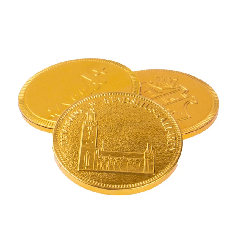 Suklaakolikko omalla logolla. Saat haluamasi kohokuviodun painatuksen kullan väriseen folioon. Kohokuvioitu kultafolio tekee siitä aidon kultakolikon näköisen suositun jakotuotteen tapahtumiin. Sisällä on herkullista maitosuklaata. Aito suklaakolikko tai suklaamitali on pidetty nostalginen makeinen, joista ei voi olla pitämättä.