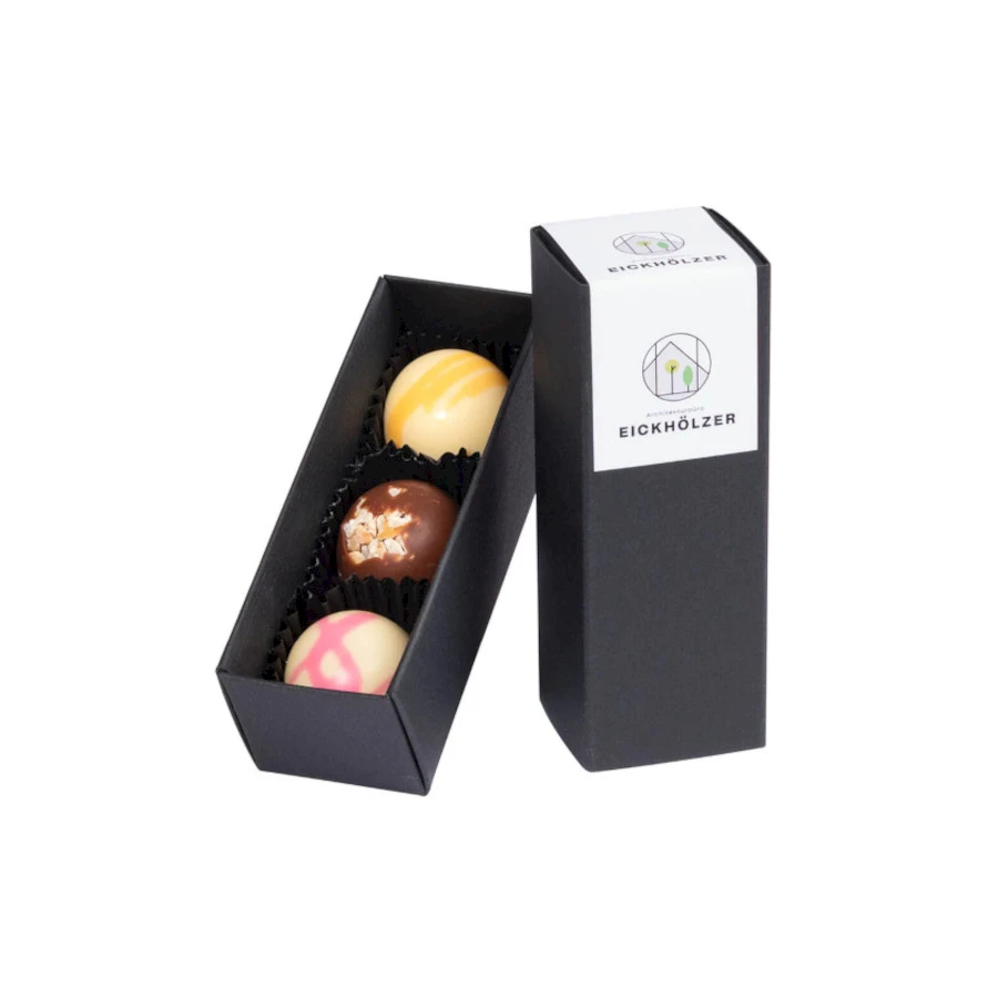 Mustassa lahjarasiassa kolme käsintehtyä suklaakonvehtia. Suklaapallo konvehdit on valmistettu ensiluokkaisista raakaâaineista ja niiden maut ovat nougat, vadelma ja passionhedelmä. Pahvirasiaan lisätään etiketti omalla painatuksellasi. Ylellinen lahja tärkeille asiakkaille.