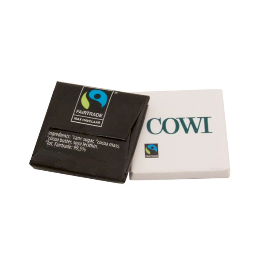 Ekologisesti valmistettua suklaata. Sisällä hienoa tummaasuklaata tai maitosuklaata. Suklaa täyttää EU:n vaatimukset ekoloogisille ruoka-aineille. Suklaa on myös Fairtrade-sertifioitu. Fairtrade reilun kaupan järjestelmän pyrkii tasa-arvoisempaan maailmaan kaupan keinoin ja se onkin maailman arvostetuin ja luotettavin eettinen brandi. Yrityksesi logopainatus tai monivärinen kuva voidaan painaa valkoiseen kääreeseen. Pyydä tarjous.Koko: 36 x 36 mm, 5 gMaku: maitosuklaa, tummasuklaa, tumma suklaa 70 %, Kestävyys: 12 kk