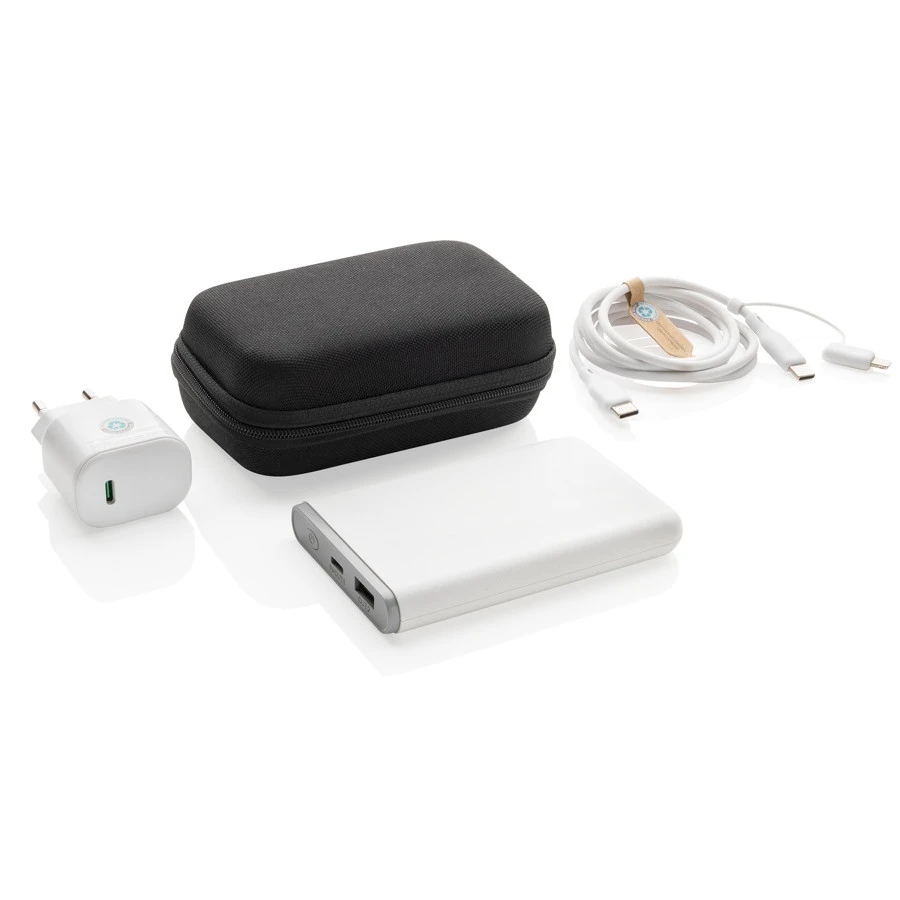 Mukana EU-sovitin, jossa on 20 W USB-C -portti, 5 000 mAh virtalähde ja 120 cm kierrätetty TPE 60 W pikalatauskaapeli (USB-C USB / Lightning). Kaapeli tukee tiedonsiirtoa ja myös suurempien laitteiden kuten kannettavien tietokoneiden lataamista. Sovitin, virtalähde ja kaapeli on valmistettu RCS-sertifioidusta kierrätetystä PC:stä, ABS:stä ja kierrätetystä TPE:stä. Pakattu FSC® -pakkaukseen. PVC-vapaa.