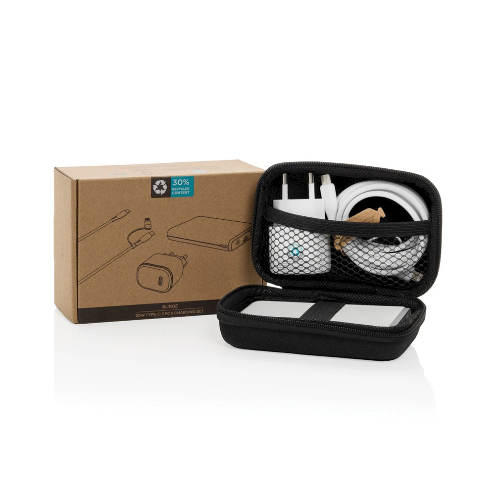 Surge RCS RPET C-tyypin lataussetti sisältää 3 kpl 20 W pikalataussetti mobiililaitteille ja muille pienille laitteille. Setissä 20W pikalatauskaapeli, paloturvallinen kotelo, virtapankki, jossa on C-tyyppi. Setti on tehty sertifioiduista kierrätysmateriaaleista. TÜV-turvallisuustestattu.
