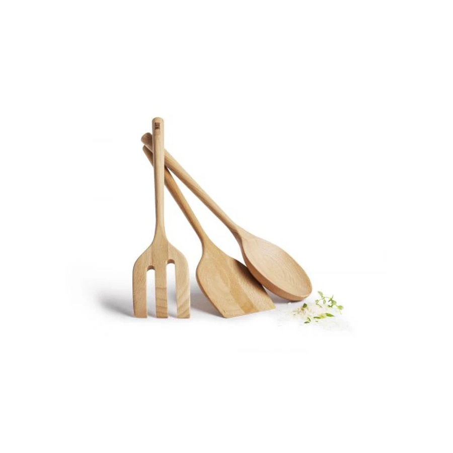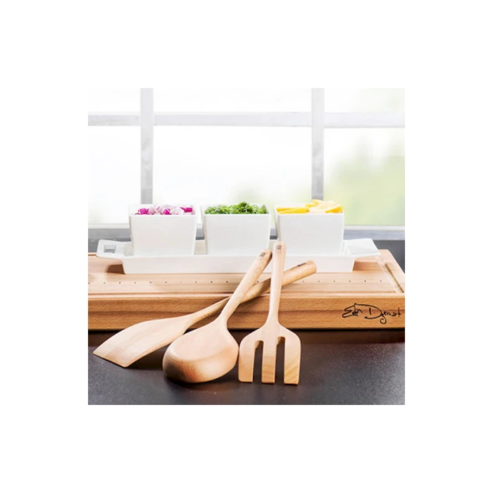 Pyökkipuiset tarjoiluottimet. Setti sisältää eurooppalaisesta pyökistä valmistetun lastan, haarukan ja kauhan. Kauniisti muotoillut puiset ottimet tuovat kattaukseen lämpöä ja maanläheisyyttä. Puiset keittiövälineet sopivat useimmille kattilapinnoille. Suosittelemme käsinpesua. Samaan sarjaa saatavana myös upea puinen leikkuulauta joka toimii myös hienona sisustuselementtinä. Materiaali: pyökkipuu