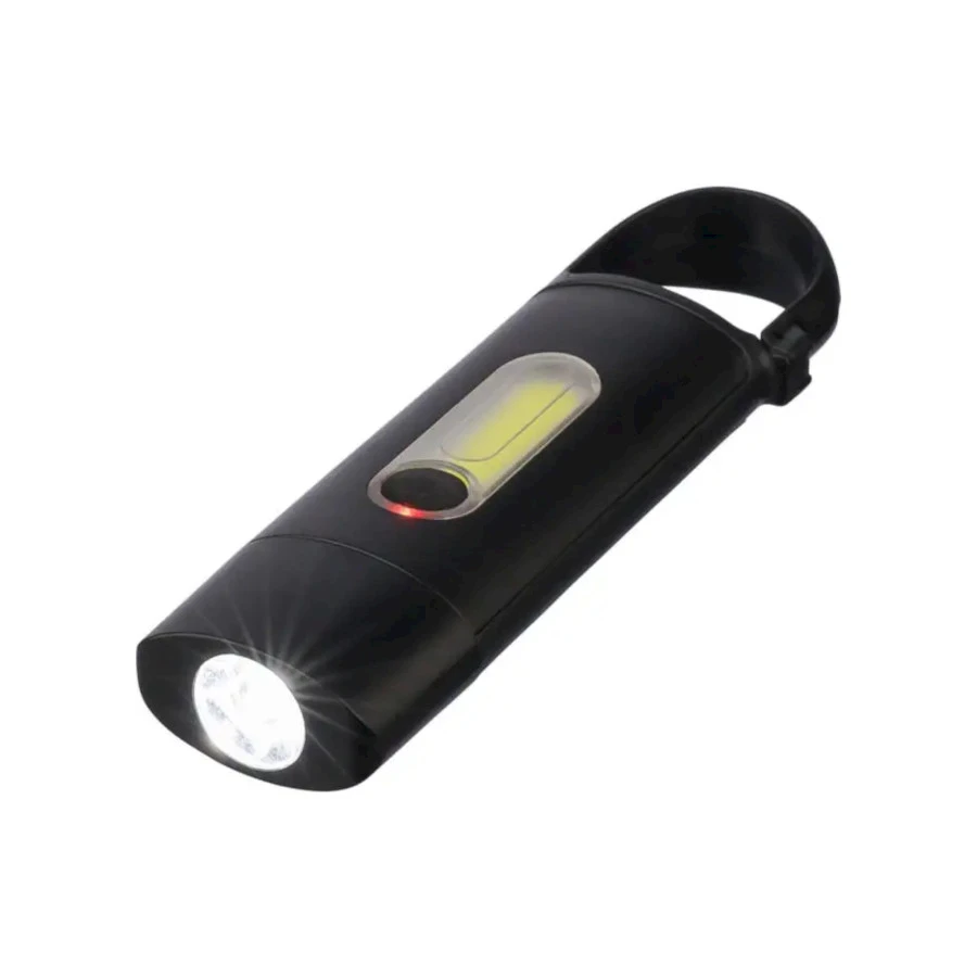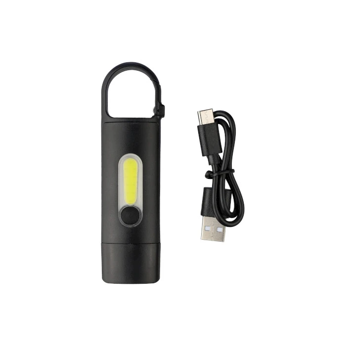 Kompakti ja kätevä ladattava taskulamppu karabiinikoukulla. Mainio apuväline arkeen tai seikkailuihin. Lampussa 3 eri toimintoa. Taskulamppu on valmistettu kierrätetystä ABS-muovista. Toimii 200 mAh:n sisäänrakennetulla akulla. Taskulampussa USB-ladattava akku ja karbiinihaka. Edessä COB-valo ja sivulla COB-valonheitin, jossa on kolme valotoimintoa. Mukana USB-C-latauskaapeli.