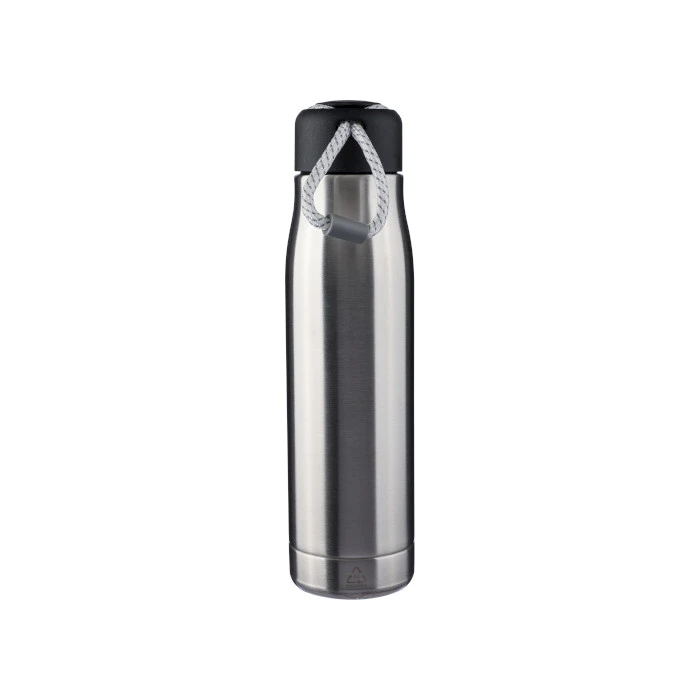 Ruostumattomasta teräksestä valmistettu termospullo kantolenkillä. Termospullo on valmistettu kierrätetystä teräksestä. Teräspullossa tuplaseinärakenne, joka pitää lämpimät juomat 12 tuntia lämpimänä ja kylmät juomat kylmänä 24 h. Termospullossa laaja painoalue brändillesi ja kestävä kantolenkki.