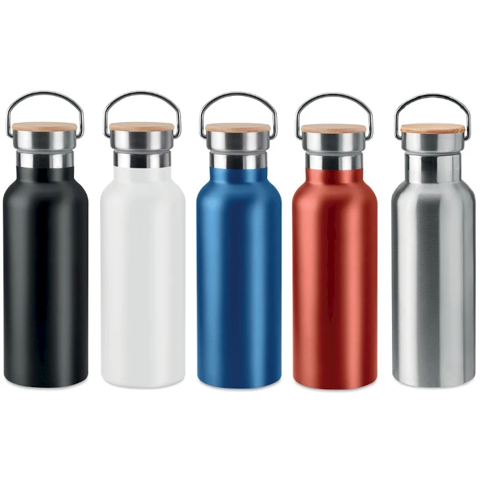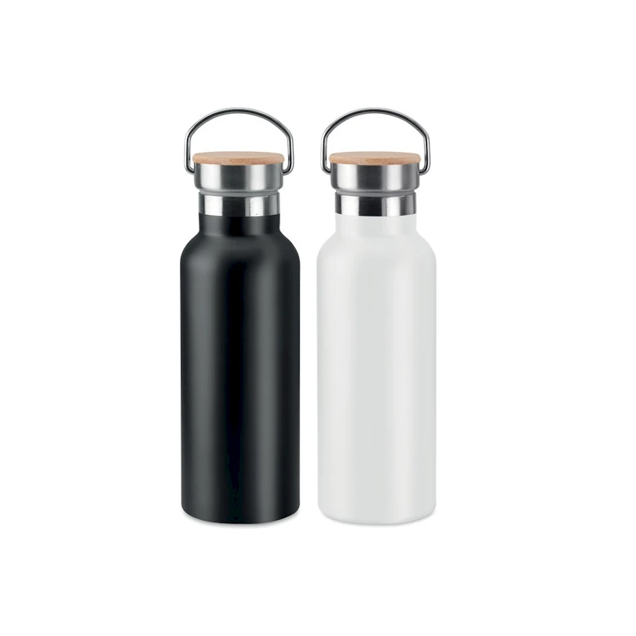 Vintage termospullo 500 ml kuumille ja kylmille juomille. Termospullossa kaksinkertainen ruostumattomasta teräksestä valmistettu pyörivä kansi ja kahva sekä bambukorkki. Termospullon ulkopinta mattapintainen.