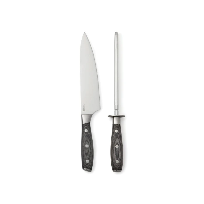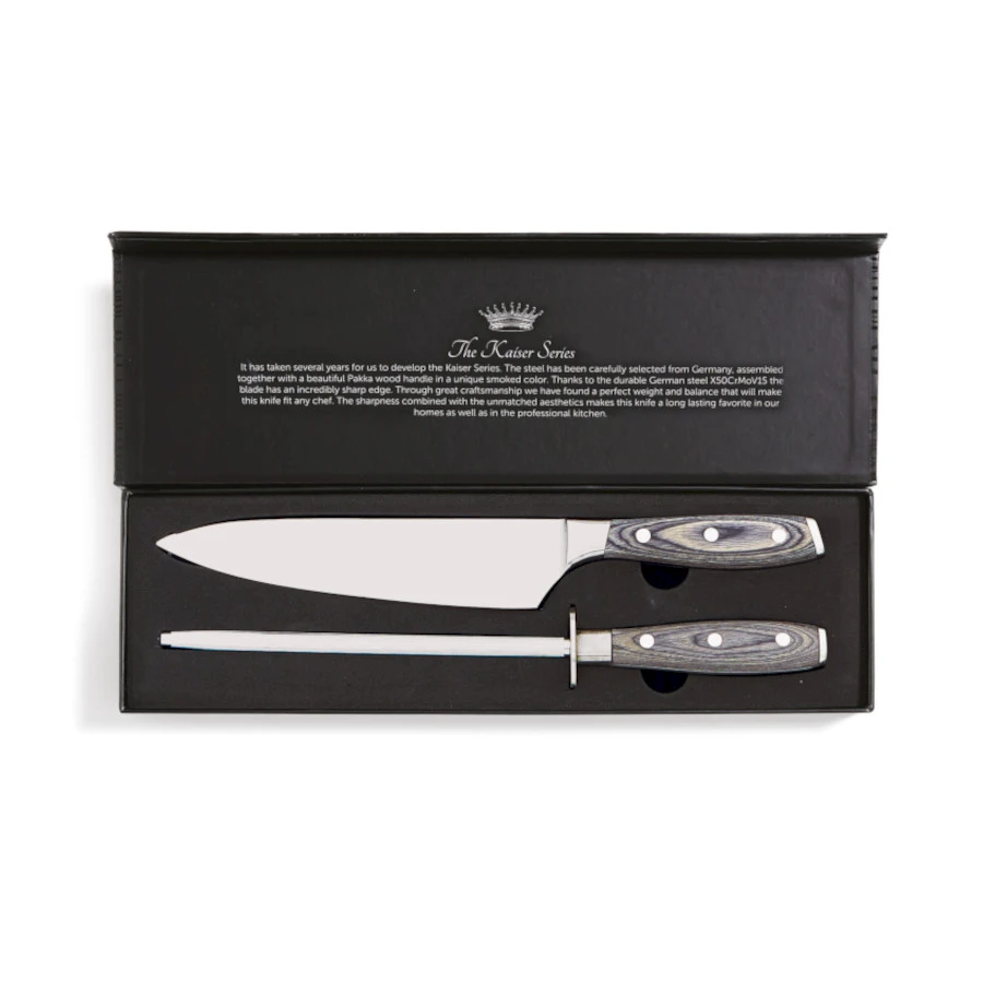 Kaiser teroitusteräsetti sisältää Kaiser-sarjan kokkiveitsen ja teroitusterän. Veitsi on valmistettu X50CrMoV15-saksalaisesta teräksestä, ja sen kahva on Pakkawood-puuta. Ergonominen kahva ja terän erinomainen tasapaino tekevät veitsestä miellyttävän ja helppokäyttöisen. Saksalaisen teräksen ominaisuudet tekevät terästä tahrankestävän, eikä se vaadi muuta hoitoa kuin satunnaisen teroituksen.