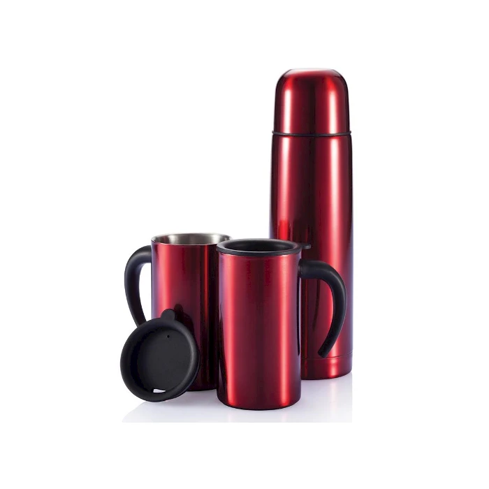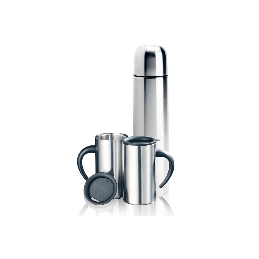 Matkailusetti jossa 500 ml tyhjiöseinämäinen teräspullo työntökansi ja kaksi 300 ml yksiseinämäistä ruostumatonta teräskuppia kannella kahvia varten. Thermossetti logolla yrityksille on erinomainen tapa tarjota asiakkaille ja henkilöstölle lämmin, käytännöllinen ja laadukas lahja, joka näkyy arjessa. Personoidut thermossetit logolla yhdistävät brändisi näkyvyyden ja käytännöllisyyden – setti sopii niin toimistoon, matkoille kuin ulkoiluun. Pakattu kätevään kantokassiin.