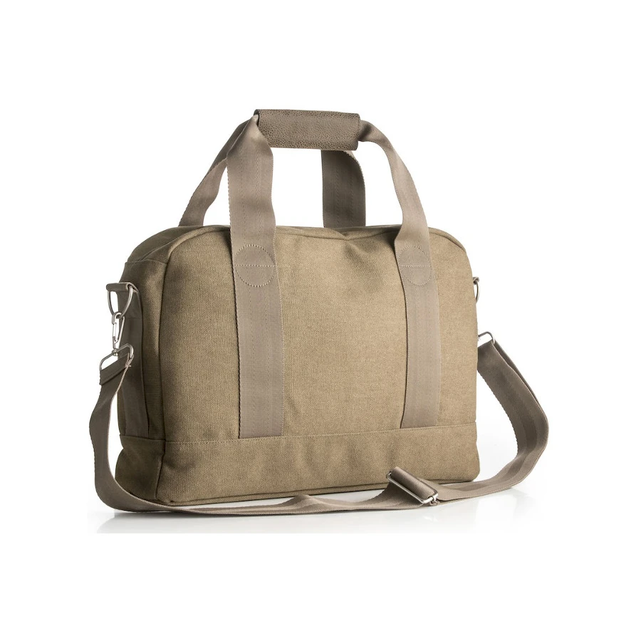Tyylikäs moderni tietokonelaukku kivipestyä beigeä canvasta. Olkalaukussa on taskuja ulko- ja sisäpuolella. Olka-/Tietokonelaukku on erinomainen esimerkiksi töihin tai opiskeluun. Sisältää olkahihnan.