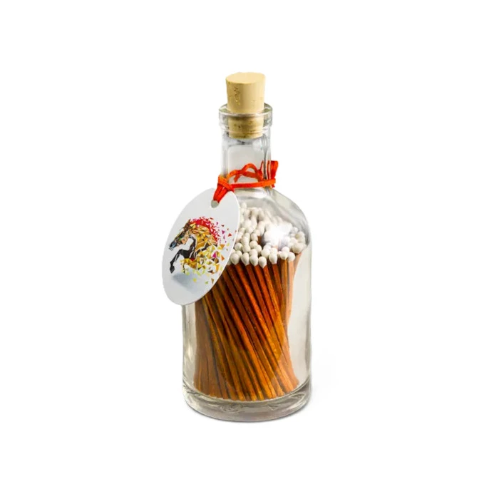 Tulitikut pullossa. Tyylikkäässä lasipullossa noin 160 kpl tulitikkuja. Tulitikkujen raapaisupään väri ja tulitikkujen väri valittavissa. Voit myös valita omanlaisen raapaisupinnan, joka kiinnitetään näkyvästi pulloon. Näin tulitikkujen sytyttäminen on helppoa. Jotta mainostulitikkujamme voidaan kuljettaa turvallisesti, lasipullot kääritään käärepaperiin ja pakataan erikseen. Valikoimassamme myös muita malleja. Valmistettu EU:ssa.