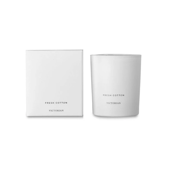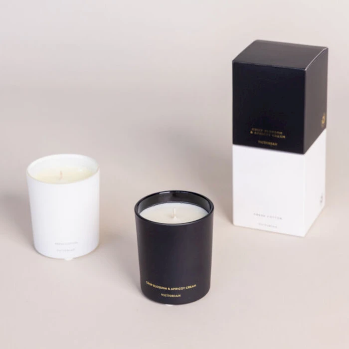 Victorianin valmistamat kynttilät ovat saatavilla kahdessa ihanassa hieman neutraalimmassa tuoksussa: Crisp Blossom & Apricot Cream sekä Candle Fresh Cotton.