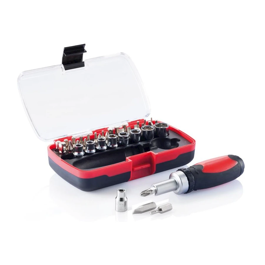 38-osainen työkalusetti sisältää 28 poranterää, 9 istukkaa: 4/4,5/5/5,5/6/7/8/10/12 mm ja räikkäväännin. Pakattu punamustaan koteloon. Koko 14,5 x 8,5 x 3,8 cm.