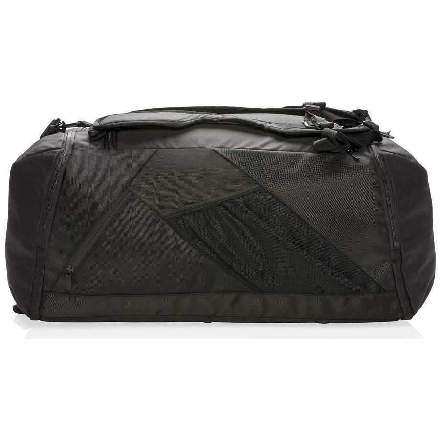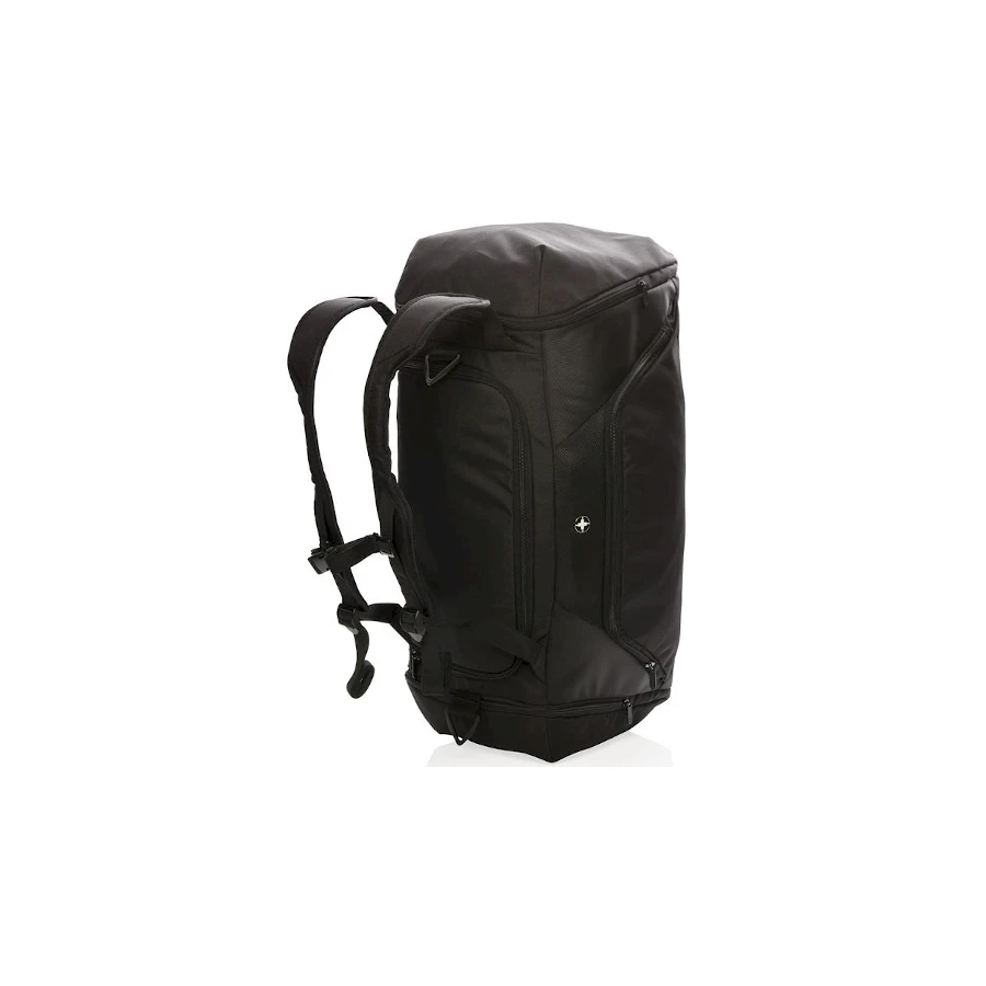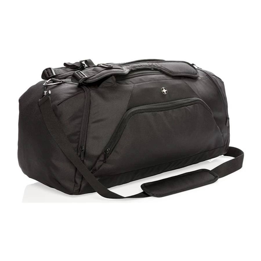Swiss Peak RFID -urheilukassi/reppu. Kevyt 1680D- ja 600D-polyesterilaukku, 2-in-1. Toimii sekä reppuna että kassina. Tilava päälokero, jossa U-muotoinen, vetoketjukiinnitteinen yläosa, sivulla lokero kengille tai likavaatteille sekä vetoketjullinen tasku. Takana pullotelinetasku ja nopeapääsyinen pikkutasku. Edessä vetoketjutasku, jossa 2 RFID-suojusta. Säädettävät olkahihnat mukavaan kantamiseen eri tavoilla. Ei sisällä PVC:tä.