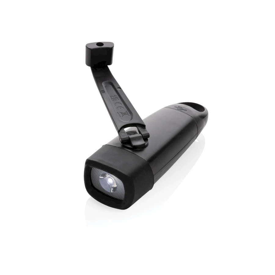 Erittäin kirkas taskulamppu, jossa on kampi. Taskulamppu on valmistettu RCS-sertifioidusta kierrätetystä ABS-muovista. Taskulampussa on uudelleenladattavaa A-luokan 620 mah litiumparistoa, joten paristoja ei tarvitse vaihtaa. Lataa helposti USB-liitännällä.120 lumenin LED-valo. Tyyppi C -portti lataamista varten. Toiminta-aika yhdellä latauksella: 3 tuntia. Lataus-aika 2 h. Kampea voidaan käyttää energian lisäämiseen hätätilanteessa. Kierrätetyn materiaalin osuus 30% tuotteen kokonaispainosta. RCS-sertifiointi takaa täysin sertifioidun toimitusketjun kierrätysmateriaaleille.