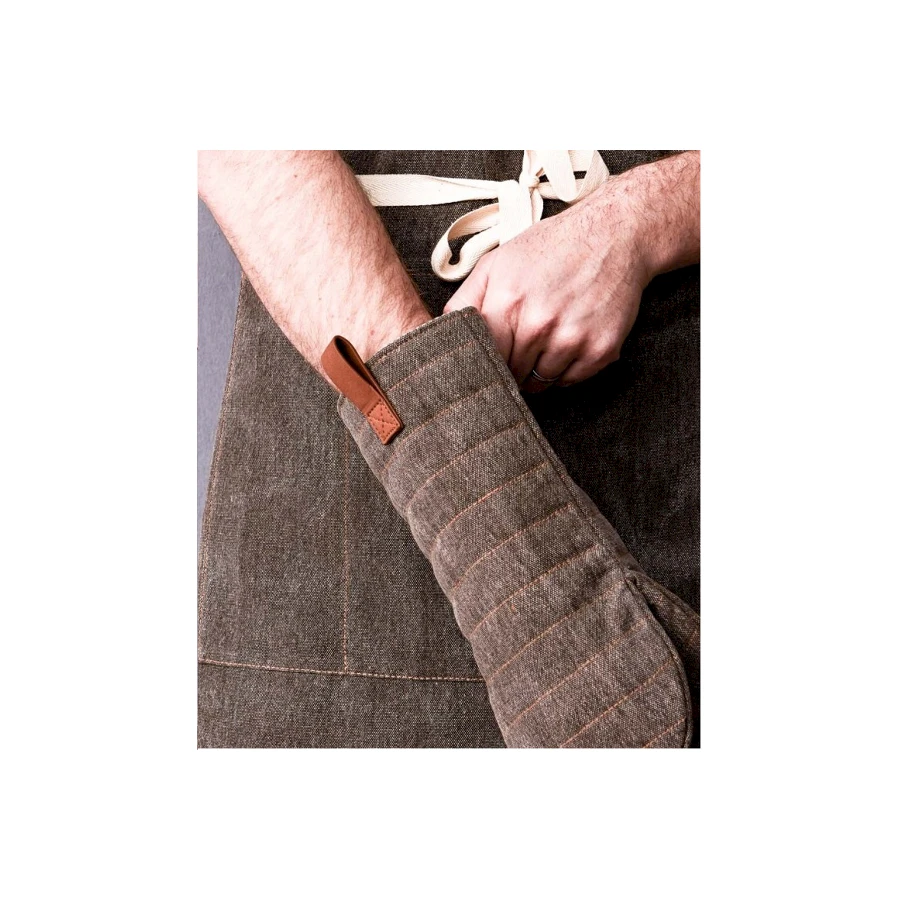 Puuvillakanvaasista tehty uunikinnas, jossa kivipesun kaltainen pinta. Sopii sekä oikea- että vasenkätisille kokeille ja leipureille.