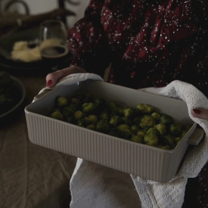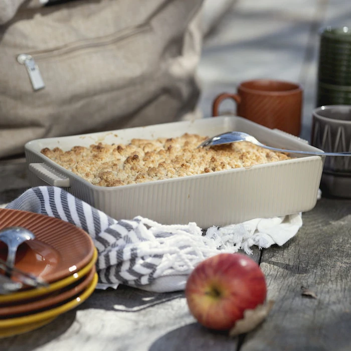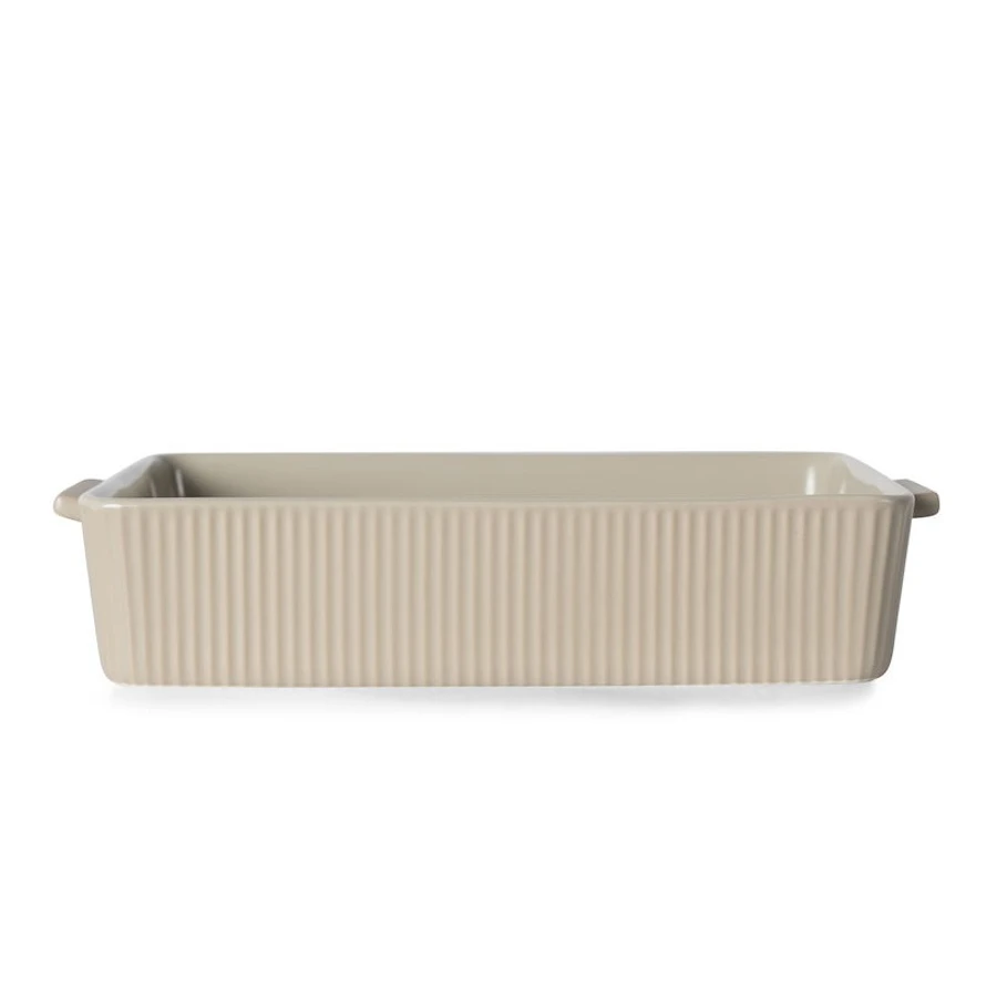 Flora Uunivuoka. Beige uunivuoka kestävästä kivitavarasta. Sivuissa olevat kahvat helpottavat vuoan nostamista. Flora on astiasarja, joissa on ominainen Sagaform -raita. Uunivuoasta saatavana kaksi kokoa S ja M.