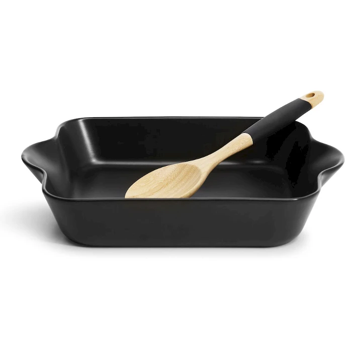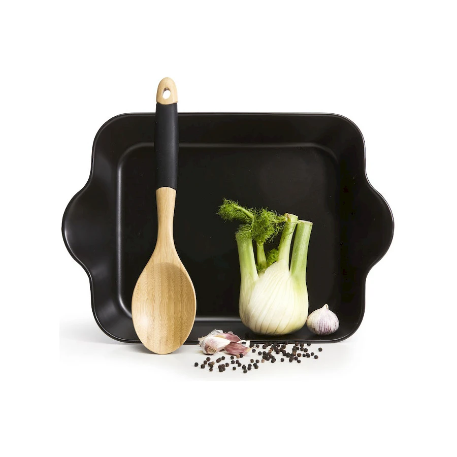 Neliö uunivuoka lusikalla ja reseptillä. Trendikäs, mattamusta, iso uunivuoka jonka mukana myös bambuinen tarjoilulusikka, reseptejä sekä inspiroivia kuvia. Kaikki yhdessä lahjapaketissa. Täydellinen lahja henkilökunnalle, asiakkaille tai yhteistyökumppaneille!
