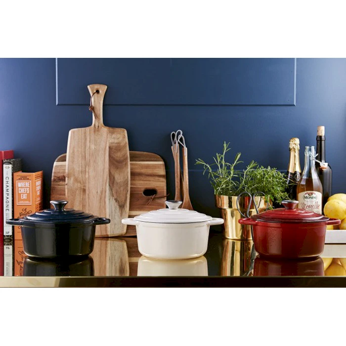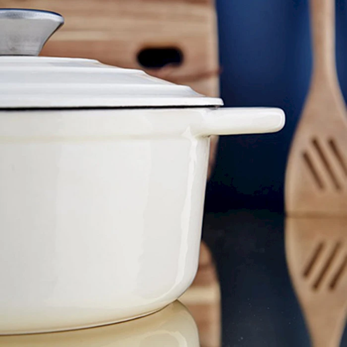 Kannellinen emaloitu valurautapata. Valurauta jakaa lämmön tasaisesti ja se sopii erinomaisesti ruskistamiseen sekä pitkään kypsennettävien pataruokien valmistukseen. Kannessa olevien nystyröiden ansiosta vesihöyry kiertää padassa tasaisesti. Pohjan muodon vuoksi pataa on kätevä käyttää ruskistamiseen ja hauduttamiseen myös liedellä. Pakattu lahjapakkaukseen, jossa mukana myös reseptivihkonen. Pata soveltuu myös kaikille liesityypeille. Pakattu lahjalaatikkoon.Koko 2,8 l, Ø 21 x 14 cm. Värit: punainen, valkoinen, navy blue