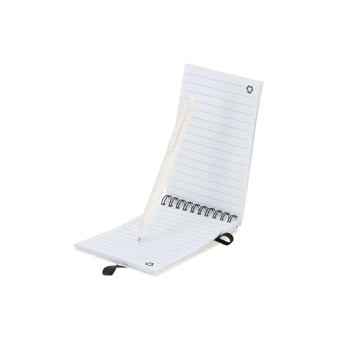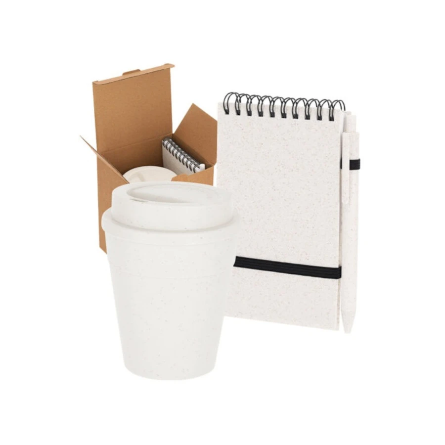 Vehnänolki lahjasetti sisältää muistikirjan, kynän sekä mukin. Muistikirjassa 70 viivoitettua sivua, vehnänolkikannet ja mustat yksityiskohdat. Vehnänolkisessa kuulakärkikynässä sininen kirjoitusmuste ja painonappi päässä. Mukana Wheat Straw -merkintä. Kannellinen kestävä PP-muovimuki. Mukin tilavuus 370 ml. Muistivihkon, kynän ja mukin voi painattaa omalla logolla tai tekstillä. Mainio lahjasetti vaikkapa uusille työntekijöille.