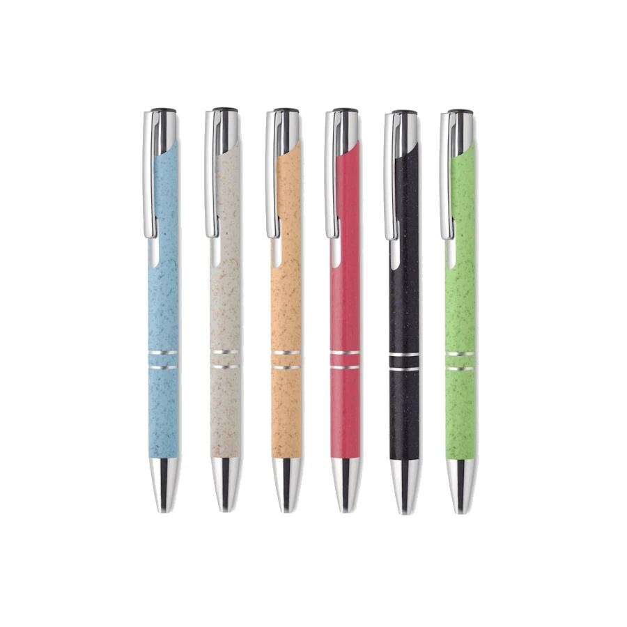 Vehnänolkikynä. Painomekanismilla toimiva vehnän olki kynä on valmistettu 50 % vehnän oljesta ja 50 % ABS muovista. Kynässä hopeiset osat. Sininen kirjoitusmuste.
