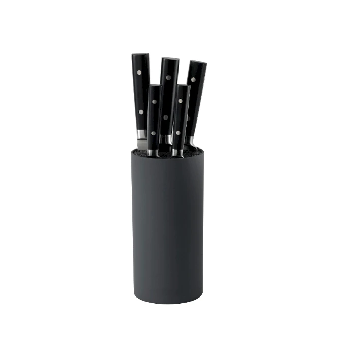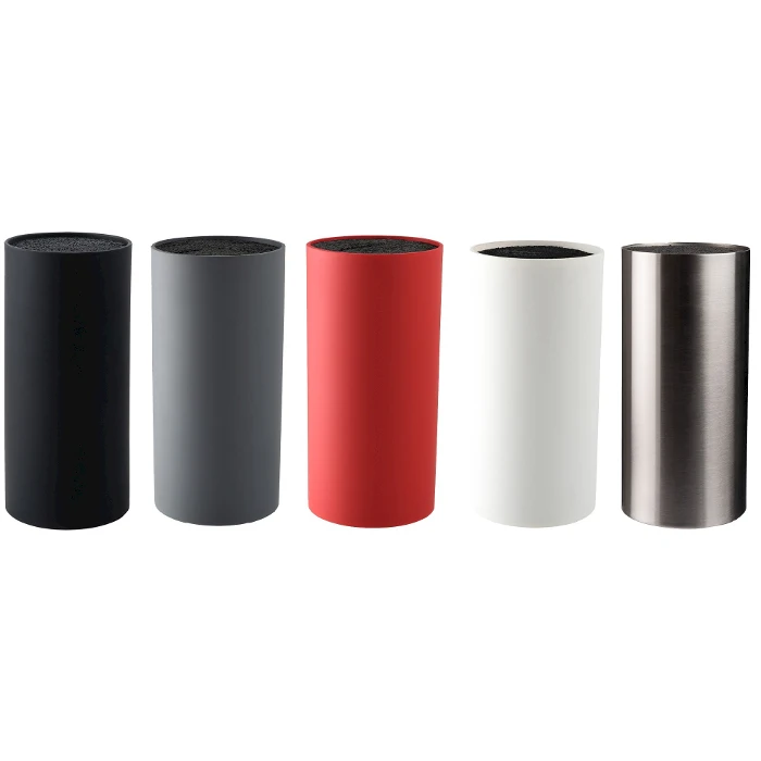 Käytännöllinen ja turvallinen, pyöreä veitsitukki. Tukin sisällä on kuminen myötäilevä materiaali veitsille. Tyylikkääseen veitsitukkiin sopivat kaikki veitset. Veitsitelineen sisus on irrotettavissa, joten se on helppo puhdistaa. Kumisista tukeista koottu sisus suojaa hyvin suosikkiveitsesi. Tukissa on mattainen kumipinta. Saatavana myös metallipintaisena. Väri: musta, valkoinen, punainen, harmaa, metalliMateriaali: ruostumaton teräs, kumiKoko: halkaisija 11 cm ja korkeus 22,5 cm