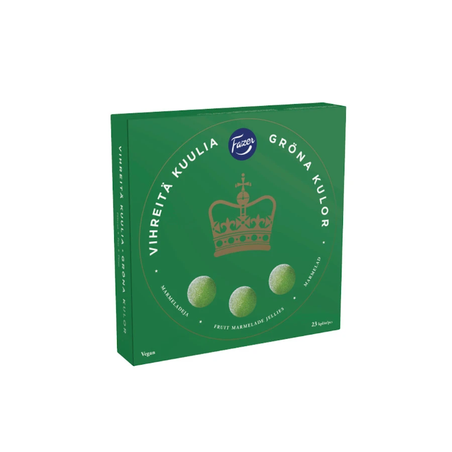 Fazerin Vihreät kuulat on vastustamattoman herkullinen marmeladiklassikko. Ylellisen pehmeät ja makeat Vihreät kuulat maistuvat hurmaavasti raikkaalle päärynälle. Vihreät kuulat eivät sisällä gluteenia, liivatetta tai laktoosia ja sopivat myös vegaaneille. Kauniit Fazerin Vihreät kuulat on ilo laittaa esille, kun on juhlan aika. Suuresta rasiasta riittää suurempaakin juhlaan.