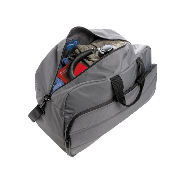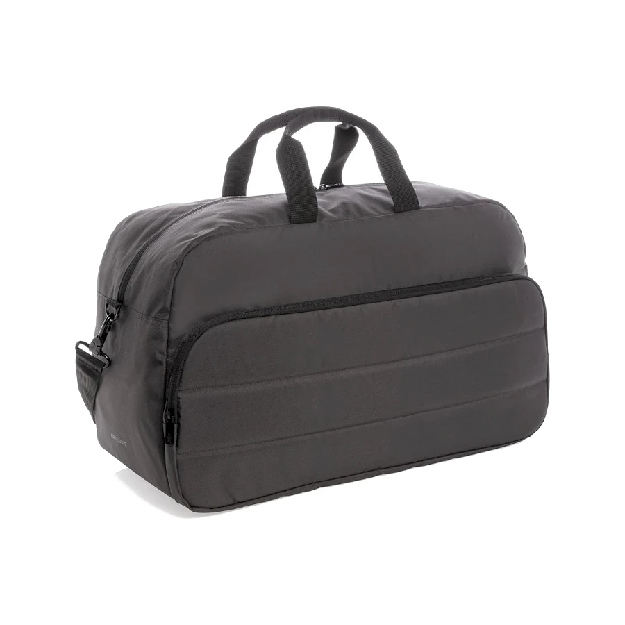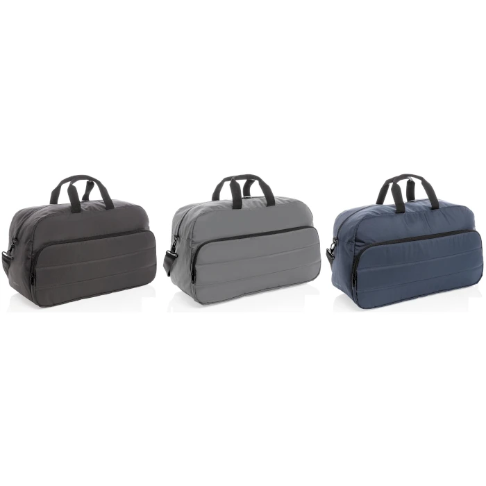 Impact sarjan RPET Aware viikonloppulaukku, on valmistettu 100 % kierrätetystä materiaalista. Valmistuksessa on käytetty 45 kierrätettyä juomapulloa ja valmistusprosessi säästää 27 litraa vettä verrattuna tavalliseen tuotteeseen. Sertifioitu tuote, jonka alkuperä on jäljitettävissä. Laukussa on tilava päätila, kaksi verkkotaskua, vetoketjullinen etutasku, jossa kaksi taskua ja kaksi kynäsilmukkaa. PVC vapaa. Tilavuus 35 litraa. Värit: sininen, musta, harmaaMateriaali: RPET kierrätetty polyesteriKoko: 32 x 22 x 55 cm