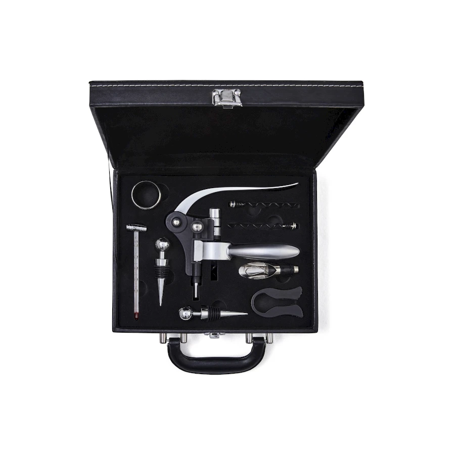 Täydellinen viinisetti viinin ystäville ylellisessä mustassa keinonahka lahjalaatikossa. Viini lahjasetti sisältää viinipullonavaajan, kaksi korkkiruuvia, kaatonokan, lämpömittarin, kaksi korkkia, kalvoleikkurin ja tipparenkaan.