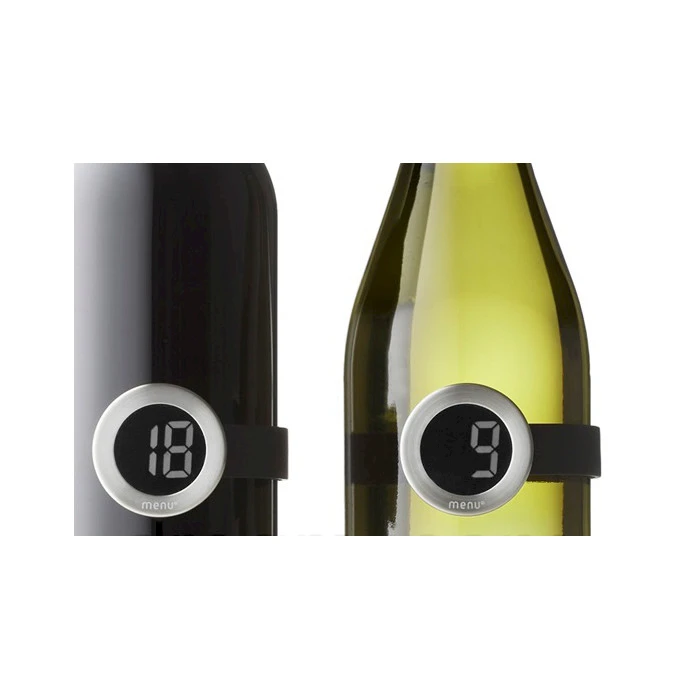 Viinin oikeat tarjoilulämpötilat ovat merkittävät viininautintoa ajatellen. Menu viinilämpömittarilla mittaat helposti viinin lämpötilan ilman että pulloa tarvitsee avata ja voit nauttia aina viinin oikean lämpöisenä. Mittari laitetaan pullon ympärille ja muutamassa minuutissa mittarin digitaalinen näyttö ilmoittaa viinin lämpötilan. Mittari on tehty kestäämään kovaakin käyttöä eikä hätkähdä muutamaa pudotusta lattiallekaan. Design Jakob Wagner. Materiaali ruostumaton teräs, muovi.Koko näytön halkaisija 4 cm.