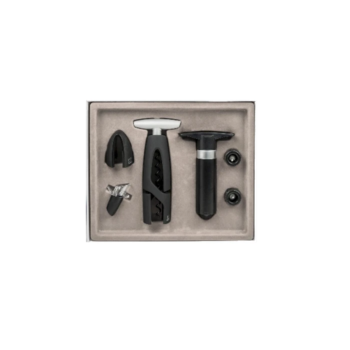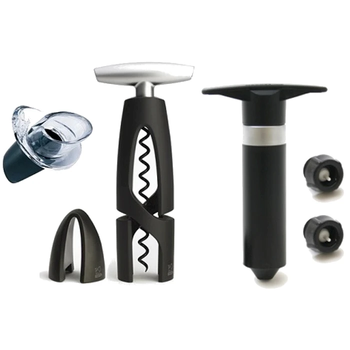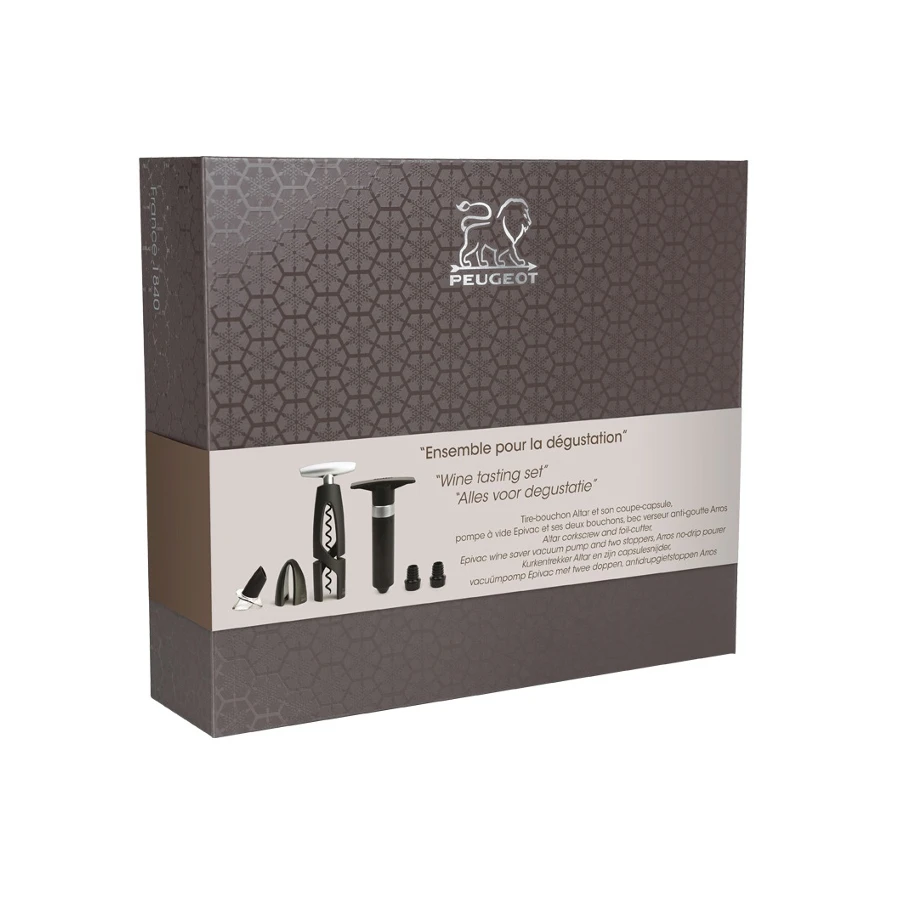 Peugeot viinin ystävän lahjapakkaus sisältää tyylikkään Altar- viinipullonavaajan, kapselileikkurin, Arros kaatonokan viinipulloon sekä viininilmaus vakuumipumpun + 2 korkkia. Pakkauksen koko: 27,6 x 23,7 x 7,2 cm