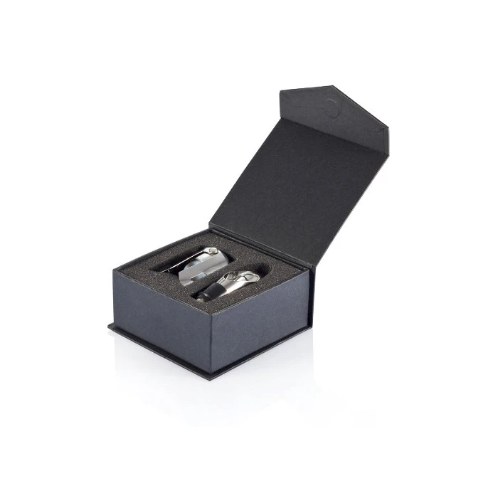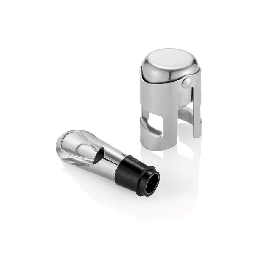 Viinikaatonokka ja shampanjapullonsulkija lahjapakkauksessa. Ruostumatonta terästä. Koko 10,7 x 11 x 5.1 cm.