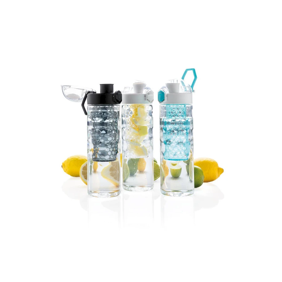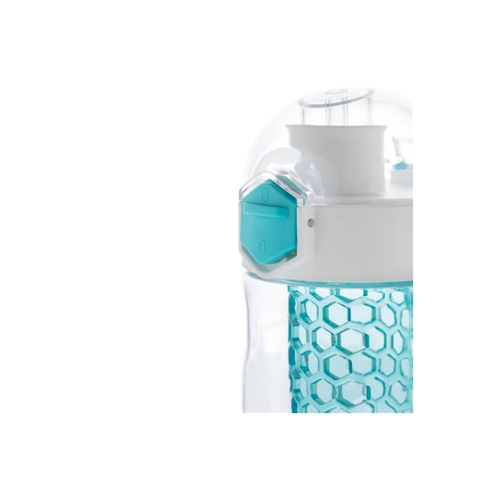 Lisää terveellisiä hedelmän makuja juomaveteesi. Tämä hunajakenno-yksityiskohdilla varustettu juomapullo mahdollistaa kätevän yhden käden juomisen. Paina painiketta ja kansi aukeaa. Käytössä erityinen lukitusmekanismi, jotta käyttäjät eivät vahingossa paina painiketta. Sisältää kantohihnan. Tämä infuusiopullo on valmistettu kestävästä ja innovatiivisesta tritanista. Hajuton ja 100 % BPA-vapaa.