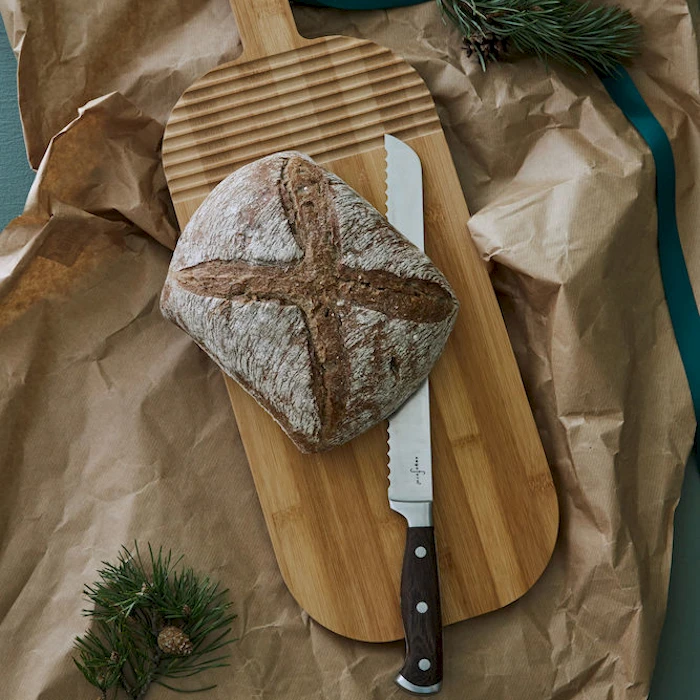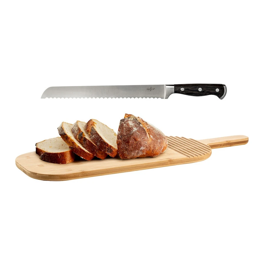 Wenge leipäveitsi leikkuulaudalla. Lahjasetti henkilöstön muistamiseen. Setti sisältää ruostumattomasta teräksestä valmistetun klassisen leipäveitsen, jonka kahva on valmistettu Wenge-puusta. Lahjasetissä mukana tamminen leikkuulauta.