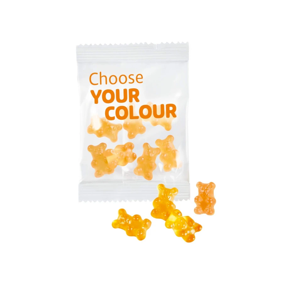 Yksiväriset Premium Nallekarkit logopainetussa mainospussissa. Pehmeä Premium Nalle maistuu raikkaalle hedelmälle. Valitse kuudesta väristä ja mausta sopivin. Valittavana vihreä (passionhedelmä), sininen (mustaherukka), läpinäkyvä (ananas), punainen (vadelma), keltainen (sitruuna) ja oranssi (appelsiini).